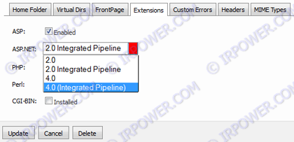 4) در صفحه جدید، در بخش Extension از منو ASP.NET اقدام به انتخاب نسخه مورد نظر نمایید.