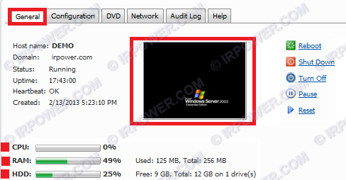 - Reset: خاموش و روشن نمودن (سخت افزاری) سرور مجازی.