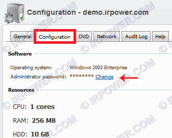 ۳-۲) ازطریق منوی Configuration و انتخاب گزینه Change میتوانید رمز عبور Administrator سرور مجازی خود را تغییر دهید.