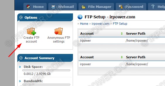 3- در صفحهی گشوده شده بر روی Create FTP Account کلیک کنید تا اکانت اف تی پی مورد نظر خود را ایجاد نمایید: