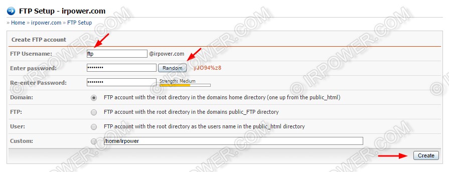 با انتخاب گزينه User، ساخت اکانت اف تی پی با دسترسی به پوشهای همنام نام کاربری در Public_html انجام خواهد شد.