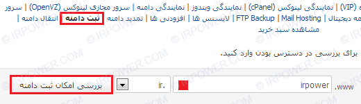 3- بخش "ثبت دامنه" را انتخاب، دامنه مورد نظر را در فیلد مشخص شده در تصویر زیر وارد و سپس گزینه بررسی وضعیت دامنه را برگزینید.